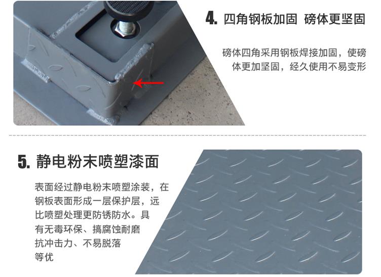2、地磅秤材質為:碳鋼,防滑咬花型臺面設計;