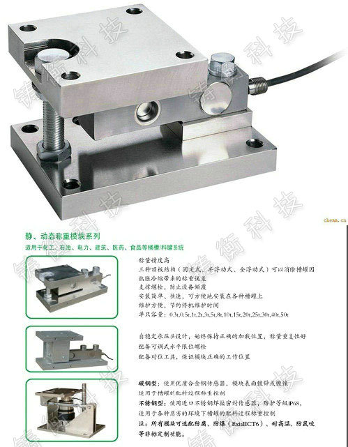 1.靜載稱重模塊:主要適用于側(cè)向力較小的靜載荷稱重場(chǎng)合。靜載稱重模塊可以非常方便地安裝在各種形狀的容器上。